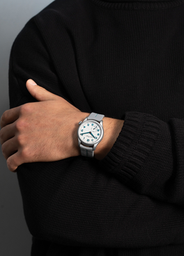 Hindi numerals on a brushed light blue dial accent this Manual winding 40mm mono-pusher chronograph.